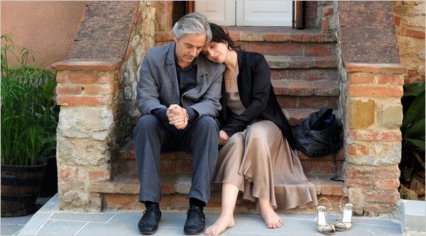 It’s difficult to say whether Juliette Binoche or Abbas Kiarostami is the star of the latter’s newest film, Certified Copy. Much comes to rest on Binoche’s delicate shoulders– the nameless character she plays is the only principal character in the film apart from co-star William Shimell– but Kiarostami’s direction, assured yet humble, constitutes bravura filmmaking that’s bold enough to excise the very perception of his presence from the events of his picture. The Iranian director’s filmmaking here favors subtlety. He and cinematographer, Luca Bigazzi, employ deceptively minimalist artistry that’s more layered and involved than its veneer of straightforwardness suggests; meanwhile Binoche, an emotional roller-coaster, takes the opposite bent. Your mileage may vary on Certified Copy depending on which approach you favor more. Regardless, the film is exquisite. It’s measured, deeply thoughtful, masterfully acted, and thematically intricate. It’s what we should expect from a veteran of the medium like Kiarostami, a man whose work I’m much less familiar with than I’d like to be. It’s completely grounded in reality and yet there is trickery at play that Orson Welles might well admire himself, woven together to create an examination of love and the intimate bonds we forge with one another. Certified Copy‘s big idea is actually quite small; the film follows Binoche’s innominate and apparently single mother as she takes author James Miller (Shimell, an opera singer) on a tour of Tuscan town she inhabits. Their interplay changes over time as they discuss James’ book– a scholarly work claiming that in art, authenticity is irrelevant– and other topics in between; eventually, so too does the nature of their relationship become altered.